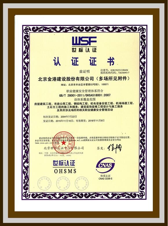 2015年11月11日,我公司順利通過北京世標(biāo)認(rèn)證中心的貫標(biāo)復(fù)審,取得新的世標(biāo)認(rèn)證證書。此次審核涉及的北京金港建設(shè)股份有限公司、北京金港場(chǎng)道工程建設(shè)股份有限公司、北京金港文景裝飾有限責(zé)任公司,均順利取證。北京世標(biāo)認(rèn)證中心有限公司總經(jīng)理李永波為我公司頒發(fā)了新證。
