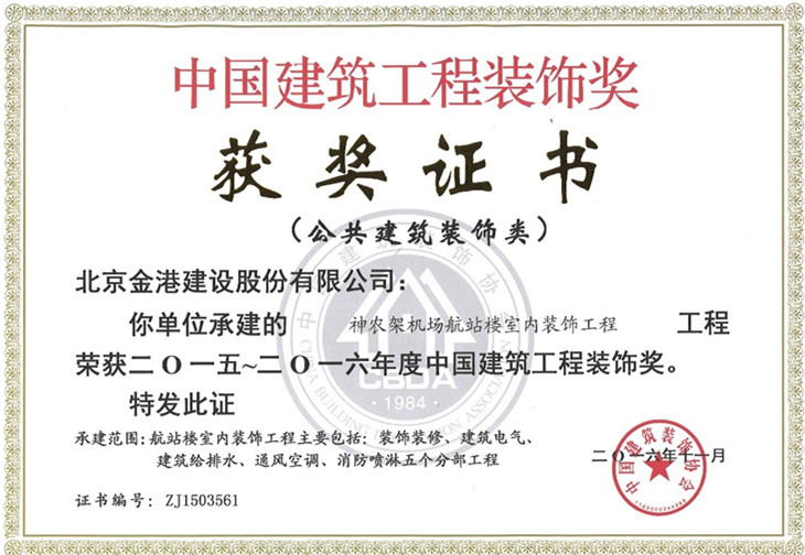 中國(guó)建筑工程裝飾獎(jiǎng)由中國(guó)建筑裝飾協(xié)會(huì)主辦,是建設(shè)部批準(zhǔn)設(shè)立的中國(guó)建筑裝飾行業(yè)的最高榮譽(yù)獎(jiǎng),獎(jiǎng)項(xiàng)包括公共建筑裝飾類、公共建筑裝飾設(shè)計(jì)類、建筑幕墻類。獲獎(jiǎng)建筑裝飾工程必須通過(guò)竣工驗(yàn)收并使用一年以上,且已通過(guò)消防驗(yàn)收和環(huán)保檢測(cè)并達(dá)到節(jié)能要求,無(wú)工程施工質(zhì)量問(wèn)題和事故隱患。經(jīng)過(guò)初評(píng)、推薦、資料審查、工程復(fù)查和專家評(píng)審等環(huán)節(jié)的嚴(yán)格評(píng)定,所有獲獎(jiǎng)工程均是設(shè)計(jì)與施工的完美結(jié)合,符合國(guó)家及工程所在地的各項(xiàng)標(biāo)準(zhǔn)和規(guī)范要求,備案手續(xù)完善,設(shè)計(jì)創(chuàng)意和施工工藝達(dá)到先進(jìn)水平的資源節(jié)約型和環(huán)境友好型的裝飾精品。
