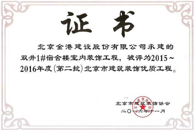 2016年12月28日,北京市建筑裝飾協(xié)會(huì)六屆三次理事會(huì)暨市優(yōu)項(xiàng)目頒獎(jiǎng)大會(huì)隆重舉行,我公司董事長(zhǎng)譚子恒及副總經(jīng)理閆麗英應(yīng)邀參會(huì),大會(huì)對(duì)2015—2016年度北京市建筑裝飾優(yōu)質(zhì)工程進(jìn)行了表彰,公司承建的華晨寶馬汽車有限公司發(fā)動(dòng)機(jī)廠綜合樓室內(nèi)裝飾工程,雙井1#宿舍樓室內(nèi)裝飾工程,雙井2#、3#宿舍樓室內(nèi)裝飾工程以卓越的設(shè)計(jì)和精良的施工質(zhì)量榮獲2015—2016年度北京市建筑裝飾優(yōu)質(zhì)工程。