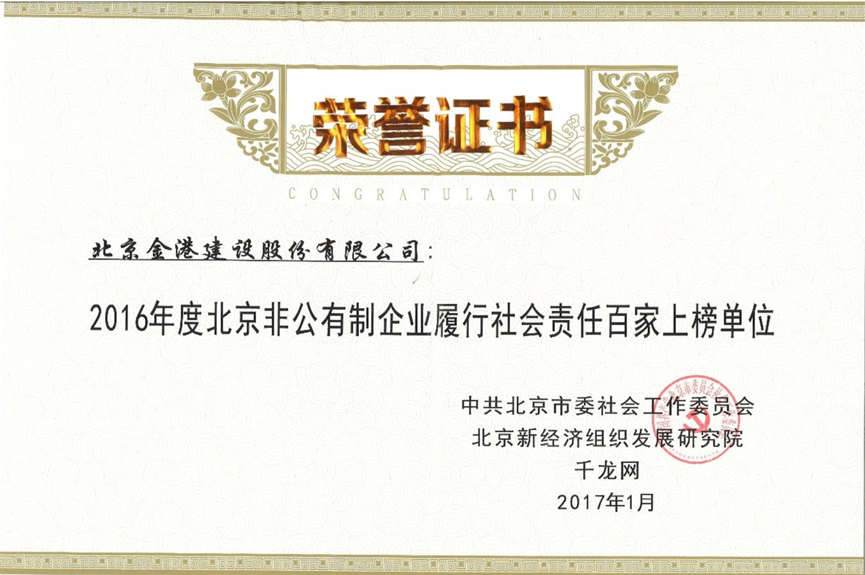 2017年1月7日,第二屆北京新經(jīng)濟組織發(fā)展高峰論壇暨北京非公有制企業(yè)履行社會責任百家上榜單位發(fā)布會在首都經(jīng)濟貿(mào)易大學舉行。公司憑借多年以來在誠信經(jīng)營、保障員工權益、積極開展公益活動等方面對社會做出的突出貢獻,入圍北京非公有制企業(yè)履行社會責任百家上榜單位。