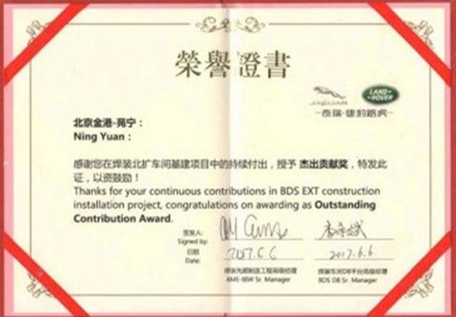 儀式最后,為表彰個(gè)人在施工過程中的突出貢獻(xiàn),業(yè)主給我司員工苑寧和趙君分別頒發(fā)了 “杰出貢獻(xiàn)獎(jiǎng)”和“突出貢獻(xiàn)獎(jiǎng)”的榮譽(yù)證書。