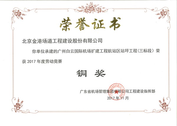 在整個工程的實施過程中,工程建設(shè)指揮部勞動競賽辦公室依據(jù)勞動競賽評比獎勵辦法及有關(guān)規(guī)定,分別在2016年年底、2017年2月13-15日對各參賽單位進行了全面檢查,結(jié)合日常監(jiān)理施工管理情況進行綜合評比。我單位在2017年底召開的在廣州白云國際機場擴建工程勞動競賽階段性表彰通報會中,喜獲銅獎。此次獲獎離不開公司領(lǐng)導(dǎo)的關(guān)心和幫助,我們會再接再厲,爭取在以后的工作中取得更大進步。